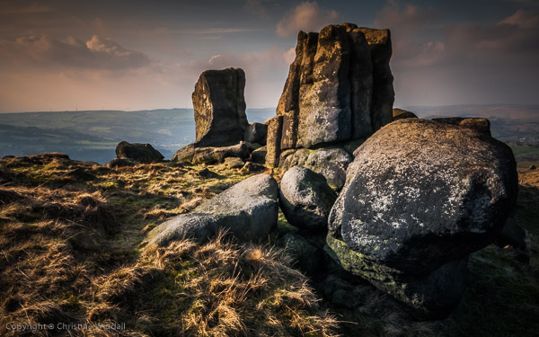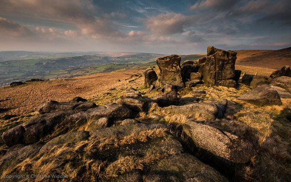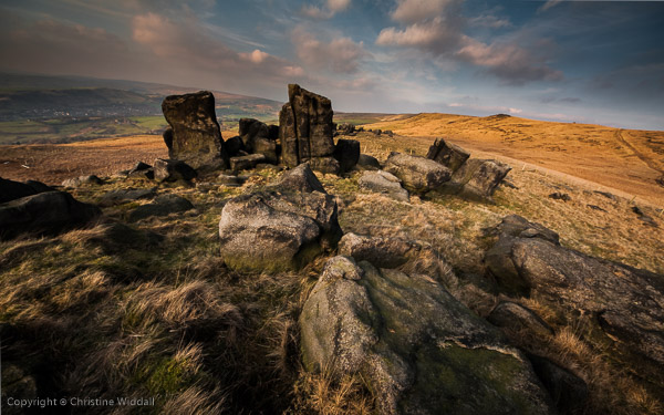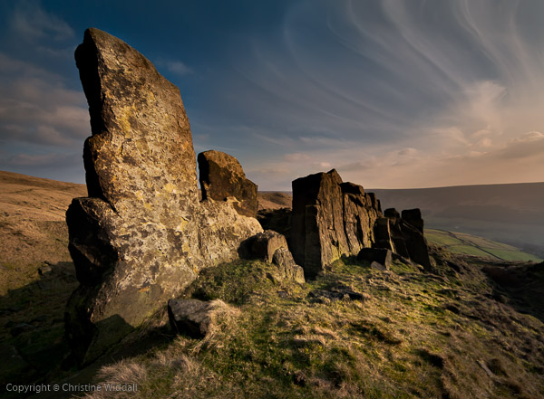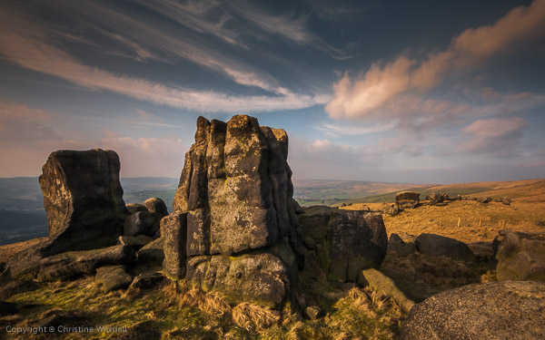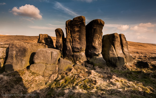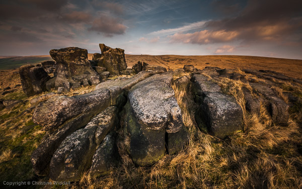 Today I’m preparing a new talk for Harrogate PS and it will include some local pictures of Saddleworth. I love being up high just before the sun sets and I found, in my back catalogue, some pictures of the Kinder Stones on top of our local hill, some of which I hadn’t really looked at before. The hill of Pots’n’Pans is easily accessed on foot from our back gate and takes my husband about half an hour to reach the top. I take longer! and I linger for long periods to take pictures as I go. There is a small abandoned quarry near the top and the remains of stones standing at the edge of it make interesting shapes with the setting sun casting a warm glow. The Kinder Stones themselves are an untidy group of boulders on the top of the hill not far from the war memorial.