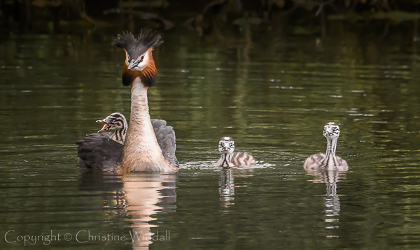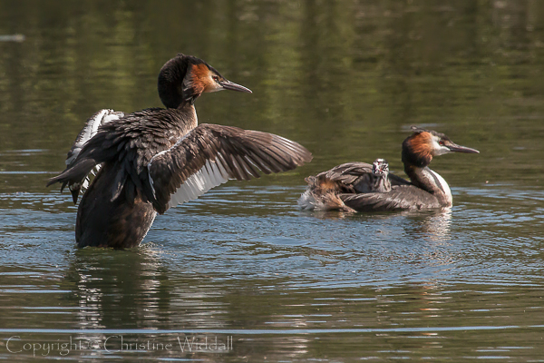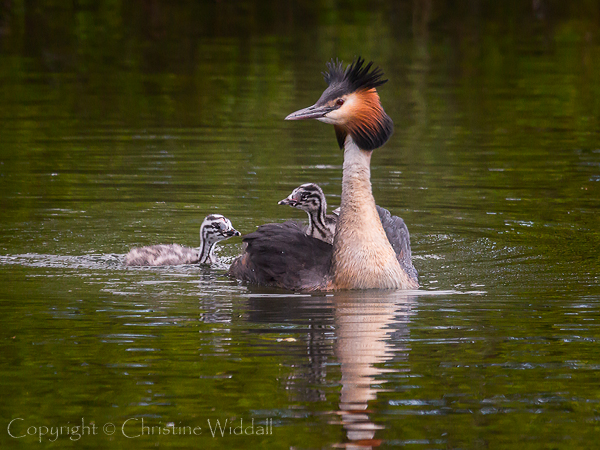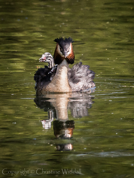 I was very lucky to be able to watch a young family of Great Crested Grebes last week in a local pond. By the time I had found out about them, the chicks were over a week old and becoming independent in getting around the pond, though they did occasionally hitch a ride on either mum or sometimes dad’s back. Unfortunately they were at quite a distance from the shore on both days that we went down to watch them, so taking photographs was a challenge.